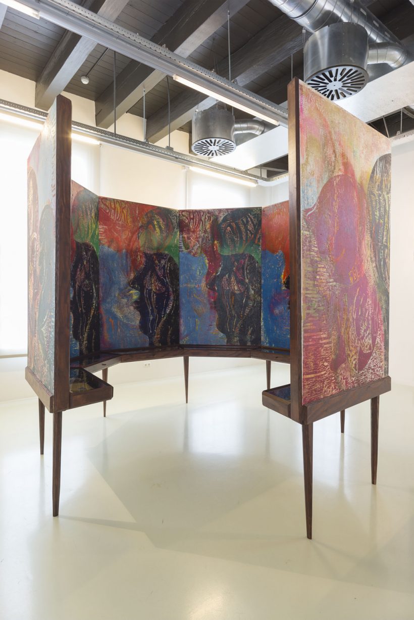 Wax-crayon, oil-stick and oil on canvas, wood, glass, various personal belongings
